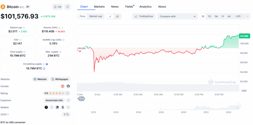 Today, things started to calm down and Bitcoin slowly climbed back, crossing the $100,000 mark again just after 12:45 PM ET. It peaked at $101,878 before cooling off to around $101,576.