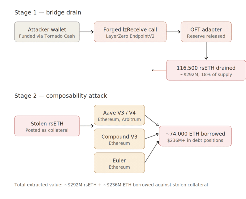 On April 18, an attacker exploited Kelp DAO‘s LayerZero-powered rsETH bridge, stealing 116,500 rsETH. The stolen tokens were immediately deposited into Aave as collateral and used to borrow over $190 million in real WETH.