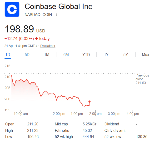 Shares of Coinbase, trading under the ticker COIN, were seen around $198 in Tuesday trading, down about 5% on the day, according to market data shared by Google Finance. The decline pushed the stock below the psychologically important $200 level after opening above $211.