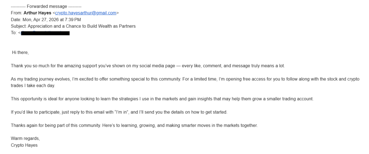 Promising exclusive access to the market moves of one of crypto’s most recognizable voices, a convincing email sent from the bogus address crypto.hayesarthur@gmail[.]com, thanks recipients for their social media engagement before dangling free daily stock and crypto trade signals to help “grow a smaller trading account.”