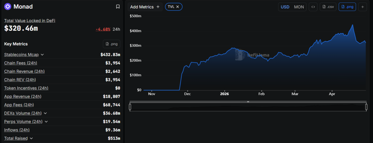 As of late April 2026 shows Monad’s DeFi total value locked (TVL) at approximately $320 million, with bridged assets pushing totals higher (stablecoin market cap around $433 million). Despite attracting such an attractive TVL amount within five months of mainnet, a closer look at Monad’s on-chain metrics reveals a fragile foundation.
