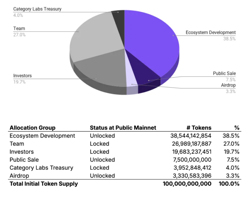 The Team allocation of 27% has a 1-year cliff followed by 48-month linear vesting, as does the Investors portion at 19.7%. Smaller slices include Public Sale at 7.5%, Airdrop at 3.3%, and Treasury/Category Labs at approximately 4%.