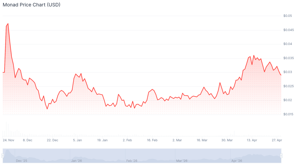 At the time of publishing, MON was trading around $0.029, down approximately 40% from its all-time high of ~$0.0488 reached shortly after mainnet in late November 2025. The token’s circulating market cap sits near $348 million, with fully diluted valuation (FDV) exceeding $2.96 billion.